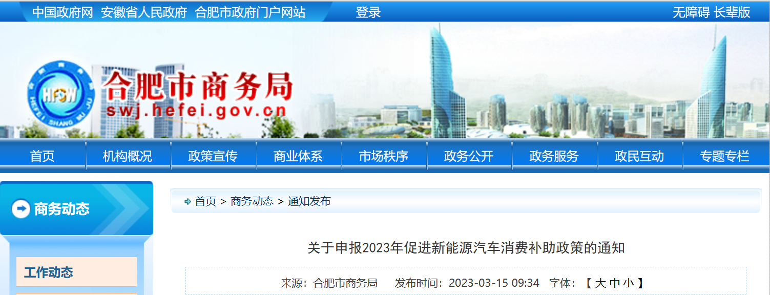 安徽省合肥市商務局關于申報2023年促進新能源汽車消費補助政策的通知為貫徹落實2023年《合肥市人民政府辦公室關于印發(fā)合肥市“提信心拼經(jīng)濟”若干政策措施的通知》...