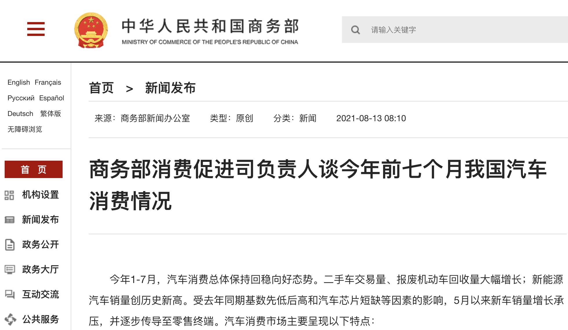 今年1-7月,汽車消費總體保持回穩(wěn)向好態(tài)勢。二手車交易量、報廢機動車回收量大幅增長;新能源汽車銷量創(chuàng)歷史新高。受去年同期基數(shù)先低后高和汽車芯片短缺等因素的影響,...
