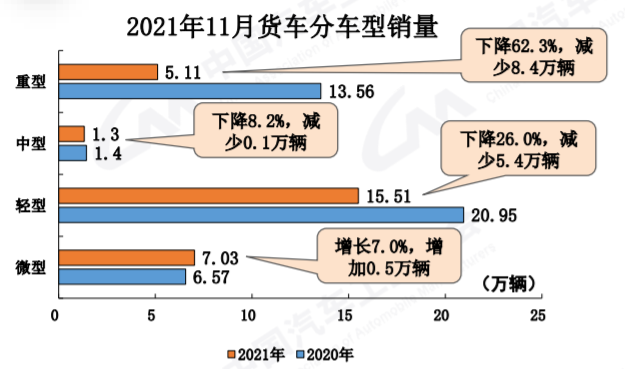 11月,商用車產(chǎn)銷分別完成35.3萬輛和33.0萬輛,環(huán)比分別增長(zhǎng)3.2%和1.1%;同比分別下降31.9%和30.3%,降幅比10月分別擴(kuò)大5和0.6個(gè)百分點(diǎn)。與2019年同期相比,商用車產(chǎn)銷同比下降18%和17.6%,降幅比10月分別擴(kuò)大13.7和8.7個(gè)百分點(diǎn)。中汽協(xié)副秘書長(zhǎng)陳士華強(qiáng)調(diào),受國(guó)六排放標(biāo)準(zhǔn)切換、“藍(lán)牌輕卡”政策預(yù)期帶來的消費(fèi)觀望、房地產(chǎn)開發(fā)行業(yè)較冷以及前期政策紅利逐步減弱等因素影響,下半年商用車市場(chǎng)需求弱于上半年。