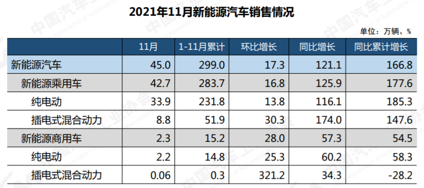 1-11月,新能源汽車產(chǎn)銷分別完成302.3萬輛和299萬輛,同比均增長(zhǎng)1.7倍;市場(chǎng)滲透率達(dá)到12.7%,高于前10月。11個(gè)月的時(shí)間,新能源汽車銷量就達(dá)到299萬輛,表明我國(guó)新能源汽車行業(yè)已經(jīng)由政策驅(qū)動(dòng)轉(zhuǎn)向市場(chǎng)拉動(dòng)。