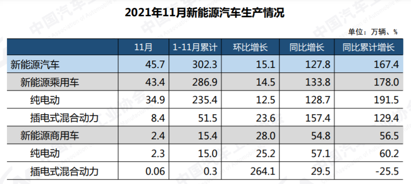 工信部原產(chǎn)業(yè)政策司副巡視員、中國(guó)國(guó)際工程咨詢公司專家學(xué)術(shù)委員會(huì)專家李萬里表示,1-11月產(chǎn)量超過300萬輛,銷量也達(dá)到299萬輛,這是一個(gè)巨大的變化,是量級(jí)的一個(gè)新躍升;也體現(xiàn)著市場(chǎng)牽引的力量更加明顯,超過了政策牽引的力量;并且今年以來新能源汽車月度產(chǎn)銷量保持連續(xù)穩(wěn)定增長(zhǎng),均為亮點(diǎn)。中汽協(xié)常務(wù)副會(huì)長(zhǎng)兼秘書長(zhǎng)付炳鋒也表示,我國(guó)新能源汽車銷量2021年逐月快速提升,新能源汽車市場(chǎng)化進(jìn)入爆發(fā)式增長(zhǎng)新階段,1-11月產(chǎn)量突破300萬輛,這是一個(gè)巨大的變化,它代表著發(fā)展新能源汽車從過去以政策驅(qū)動(dòng)為主,轉(zhuǎn)向了市場(chǎng)驅(qū)動(dòng)。