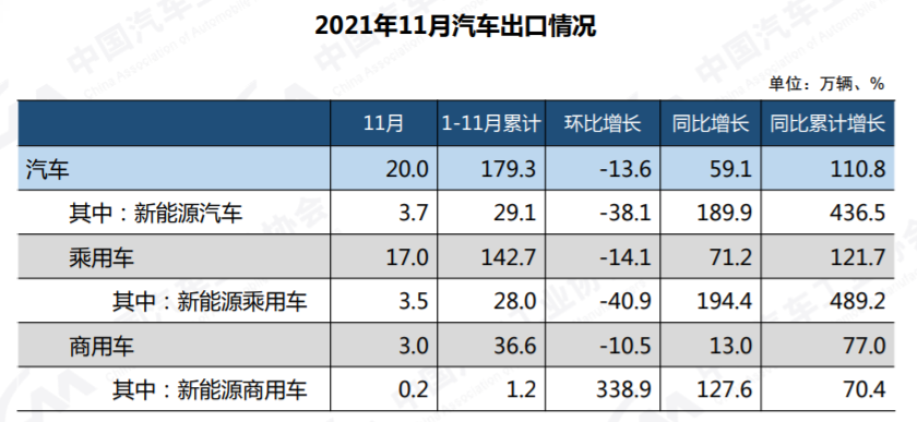 11月,汽車出口量雖然較上月有所下降,但仍達(dá)到20萬輛,同比增長(zhǎng)了59.1%,我國(guó)的汽車出口市場(chǎng)仍處于上升區(qū)間。其中,新能源汽車本月的出口貢獻(xiàn)率達(dá)到了32.9%。1-11月,汽車企業(yè)出口179.3萬輛,同比增長(zhǎng)1.1倍。中汽協(xié)副總工程師許海東表示,隨著中國(guó)品牌乘用車海外戰(zhàn)略的不斷推進(jìn),中國(guó)品牌出口有望表現(xiàn)得越來越好。