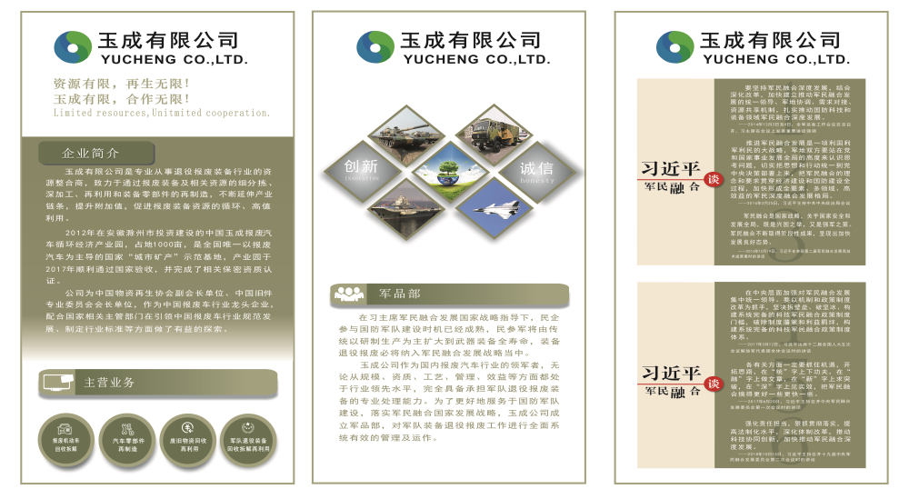軍品部成立以來(lái),以突出軍民融合、循環(huán)再生、綠色環(huán)保、可持續(xù)發(fā)展等特色,及時(shí)跟蹤了解退役裝備進(jìn)展情況,先后進(jìn)行黨建氛圍營(yíng)造,軍品部宣傳手冊(cè)、退役裝備處理方案研究等系列準(zhǔn)備工作。