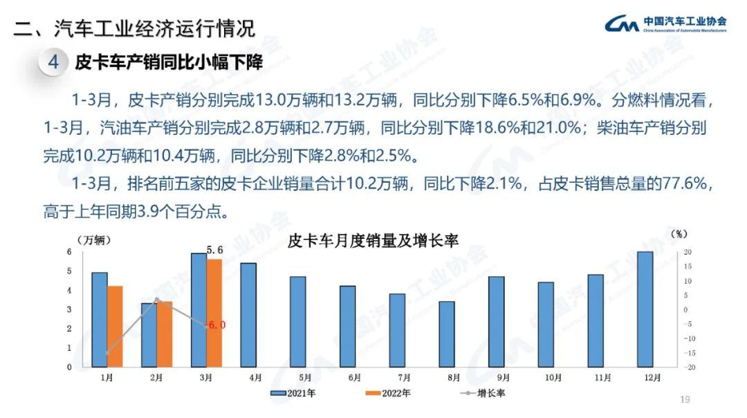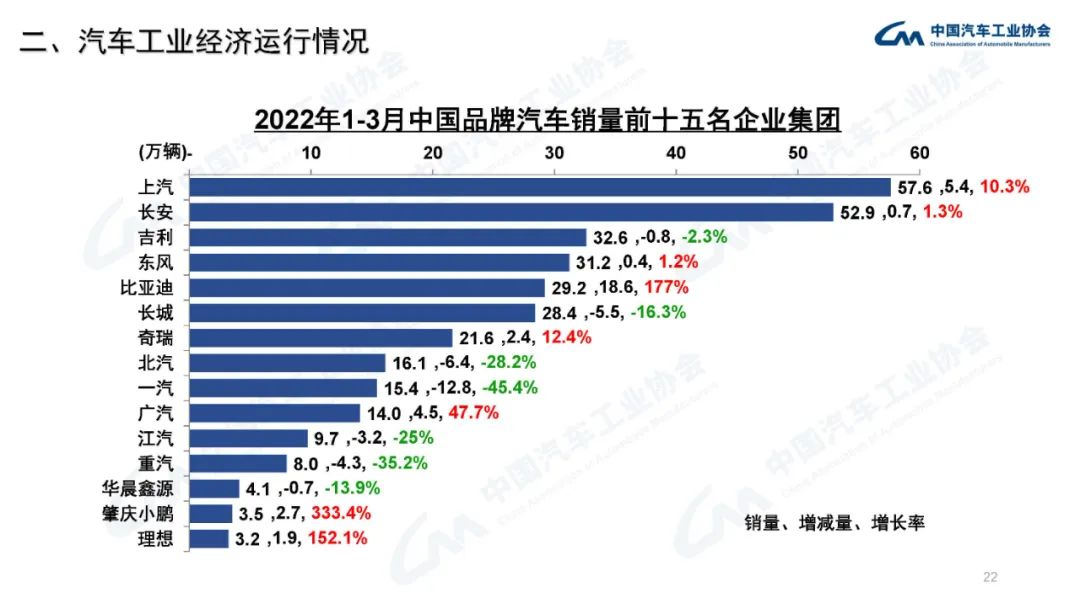2022年3月,國內(nèi)疫情近期多發(fā),市場主體困難明顯增加,經(jīng)濟循環(huán)暢通遇到一些制約,新的下行壓力進一步加大。從汽車供給端看,芯片短缺的情況沒有得到明顯緩解,動力電池原材料價格快速上漲,進一步推高企業(yè)產(chǎn)品制造成本,汽車企業(yè)生產(chǎn)經(jīng)營活動受到一定影響,總體形勢不及預(yù)期;從汽車消費端看,消費動能明顯不足,與同期相比,呈現(xiàn)一定幅度下降。
