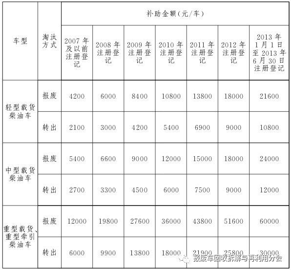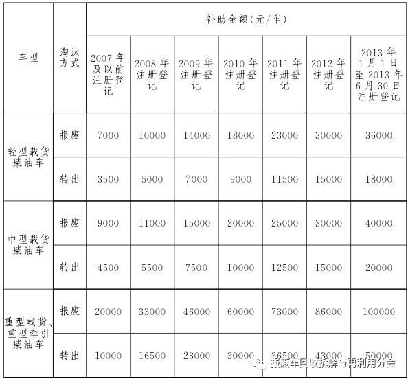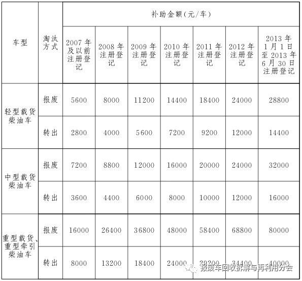 2017年9月21日至2019年9月20日期間,報廢或轉(zhuǎn)出高排放老舊柴油貨運車可享受政府補助。其中,報廢車輛需在報廢期限前1年及以上進行報廢方可享受政府補助。報廢或轉(zhuǎn)出時間以公安交通管理部門提供的車輛檔案注銷或轉(zhuǎn)出時間為準。