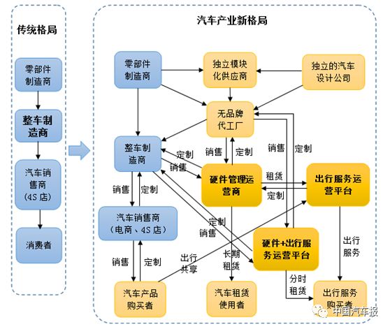 隨著汽車消費側(cè)出現(xiàn)消費者從買車到租車,從購買汽車產(chǎn)品轉(zhuǎn)向購買出行服務(wù),傳統(tǒng)整車企業(yè)通過產(chǎn)品品牌對消費者的影響力減弱;隨著汽車電動化、數(shù)字化、網(wǎng)絡(luò)化和平臺化的發(fā)展趨向,傳統(tǒng)整車企業(yè)通過垂直分工體系對供應(yīng)鏈的控制力逐步減弱;隨著具有典型互聯(lián)網(wǎng)模式、對消費者偏好和需求有充分了解的平臺公司崛起,以傳統(tǒng)整車企業(yè)為中心的產(chǎn)業(yè)流程正在改變,產(chǎn)業(yè)重心正在從汽車制造向出行服務(wù)轉(zhuǎn)移。汽車產(chǎn)業(yè)經(jīng)歷了上百年的發(fā)展,以傳統(tǒng)整車企業(yè)為中心、大規(guī)模生產(chǎn)和大規(guī)模銷售模式為主導(dǎo)的傳統(tǒng)汽車產(chǎn)業(yè)格局正在走向以滿足個性化消費和出行服務(wù)為中心的新產(chǎn)業(yè)格局。下圖為汽車傳統(tǒng)產(chǎn)業(yè)格局和新產(chǎn)業(yè)格局的對比。